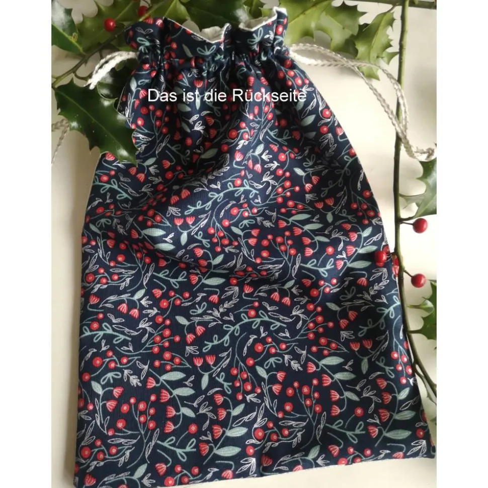 Der Beutel ist gefüttert und besitzt einen praktischen Tunnelzug mit Leinenkordel. Das Innenfutter besteht ebenfalls aus Stoff der Serie Merrymaking. Die Vorderseite zeigt ein vierer Motiv aus dem Panel, während die Rückseite im Design des Tunnelzuges gehalten ist.