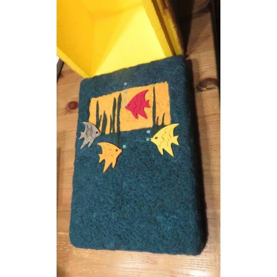 Durch die Veredelung mit Filzwolle ( Trocken – oder Nadelfilzen ), aufgeklebten Filzplatten und Filzfiguren, sowie gelber Acrylfarbe wurde die Box zu einer schönen Geschenkverpackung.