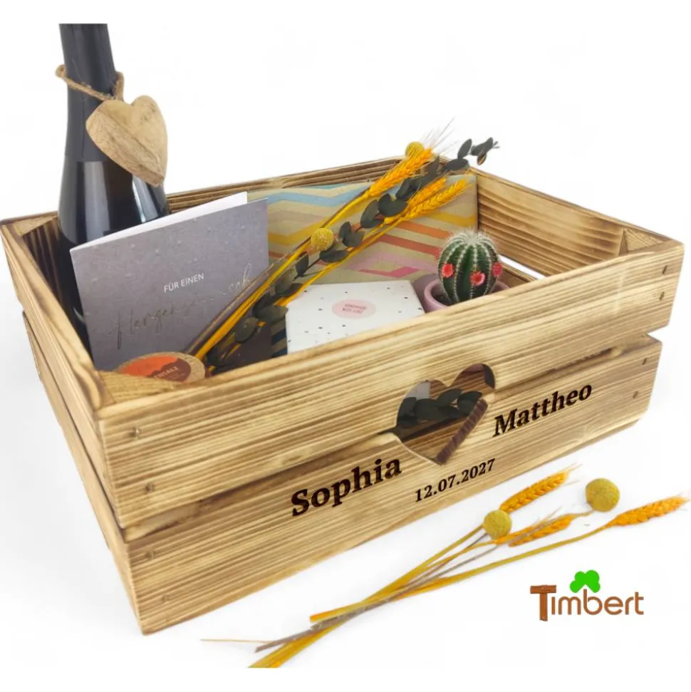 Diese Kiste kann mit deinem Wunschtext versehen werden, sei es ein Name, ein Datum oder eine liebevolle Botschaft. Die Gravur wird tief in das Holz eingebrannt, ist sehr gut sichtbar und langlebig, sodass die Kiste auch langfristig ein schönes Erinnerungsstück bleibt.