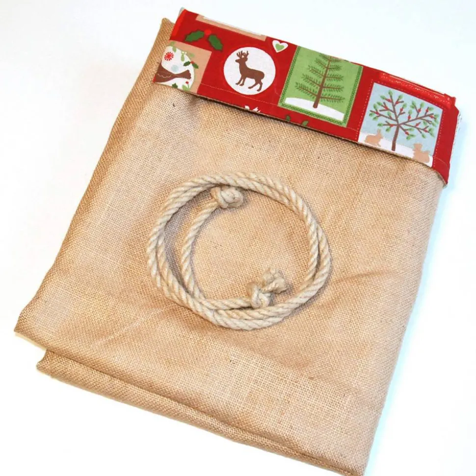 Der Sack besteht von außen aus typischen Rupfenstoff. Innen ist er komplett mit einem weihnachtlichen Baumwollstoff gefüttert und kann auch anders herum benutzt werden. Zum Binden wird eine Kordel mitgeliefert.