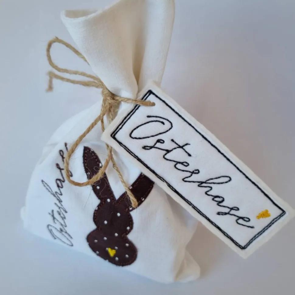 Es ist bestickt mit einem Häschen und der Aufschrift „Osterhase“ und wird mit einem dünnen Juteband – an dem noch ein passendes Label hängt – zugebunden.