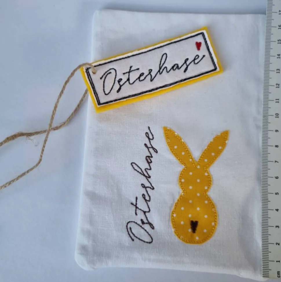 Geschenkesäckchen mit passendem Label für Ostern - OSTERHASE - in gelb mit weißen Pünktchen von he-ART by helen hesse