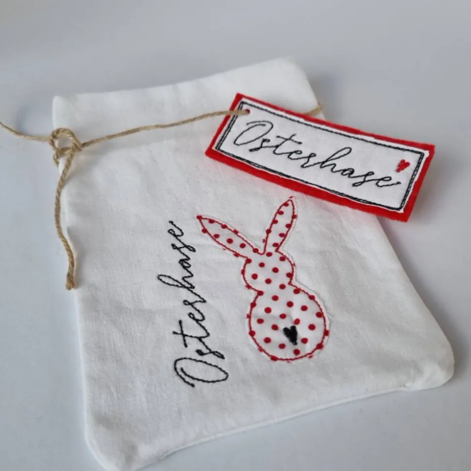 Es ist bestickt mit einem Häschen und der Aufschrift „Osterhase“ und wird mit einem dünnen Juteband – an dem noch ein passendes Label hängt – zugebunden.