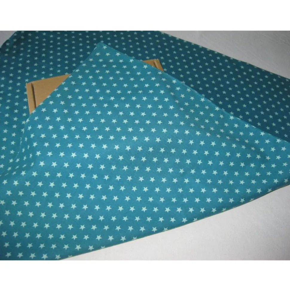 Dieses Tuch hat das Maß: B 66 cm x L 66 cm. Der Stoff ist petrolfarben mit weißen Sternen.