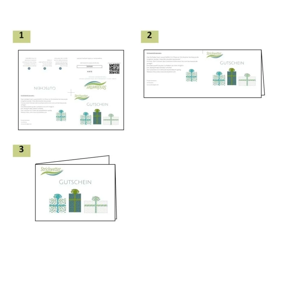 Du bekommst den Gutschein per E-Mail als pdf-Datei. Diese pdf-Datei kannst du auf einem DIN A4-Blatt ausdrucken und zu einem Gutschein falten. Siehe hierzu auch das Bild mit der Faltanweisung. Achtung: Je nach Drucker ergibt sich bei einigen Motiven ein weißer Druckrand.