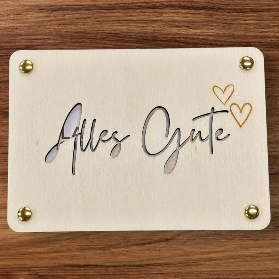 Die feine Gravur, die je nach Motiv teilweise durchgelasert ist, sorgt nicht nur für eine einzigartige Optik, sondern gibt auch den Blick auf das Innere frei – denn zwischen den beiden Holzplatten lassen sich Geldscheine, kleine Gutscheine oder liebe Botschaften platzieren. So wird aus einem einfachen Geldgeschenk eine persönliche, stilvolle und emotionale Geste.