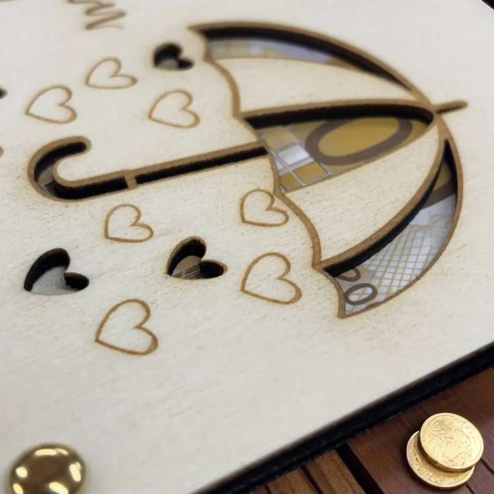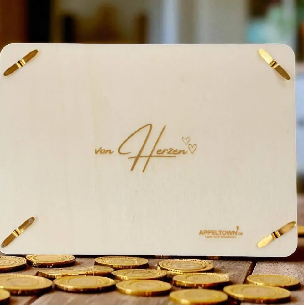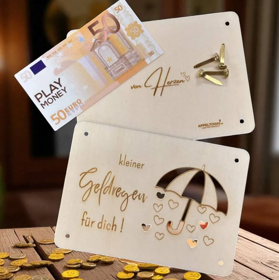 Die feine Gravur, die je nach Motiv teilweise durchgelasert ist, sorgt nicht nur für eine einzigartige Optik, sondern gibt auch den Blick auf das Innere frei – denn zwischen den beiden Holzplatten lassen sich Geldscheine, kleine Gutscheine oder liebe Botschaften platzieren. So wird aus einem einfachen Geldgeschenk eine persönliche, stilvolle und emotionale Geste.