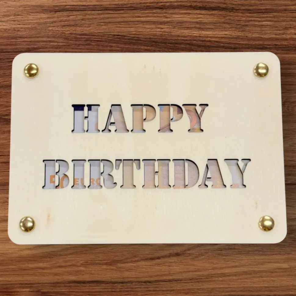 Die feine Gravur, die je nach Motiv teilweise durchgelasert ist, sorgt nicht nur für eine einzigartige Optik, sondern gibt auch den Blick auf das Innere frei – denn zwischen den beiden Holzplatten lassen sich Geldscheine, kleine Gutscheine oder liebe Botschaften platzieren. So wird aus einem einfachen Geldgeschenk eine persönliche, stilvolle und emotionale Geste.