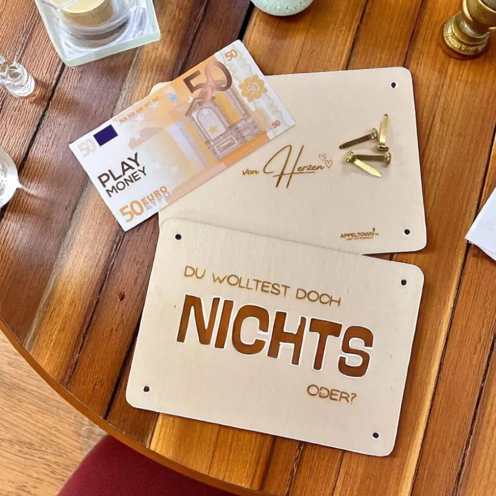 Die feine Gravur, die je nach Motiv teilweise durchgelasert ist, sorgt nicht nur für eine einzigartige Optik, sondern gibt auch den Blick auf das Innere frei – denn zwischen den beiden Holzplatten lassen sich Geldscheine, kleine Gutscheine oder liebe Botschaften platzieren. So wird aus einem einfachen Geldgeschenk eine persönliche, stilvolle und emotionale Geste.