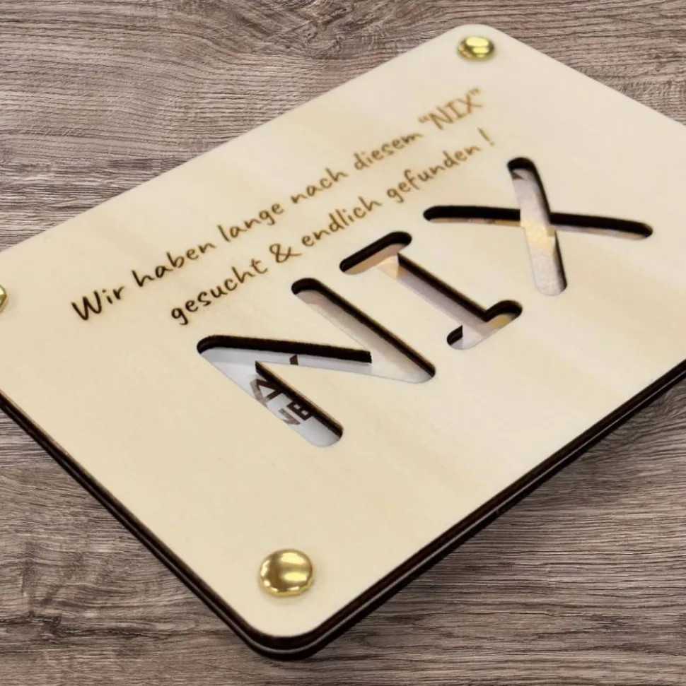 Die feine Gravur, die je nach Motiv teilweise durchgelasert ist, sorgt nicht nur für eine einzigartige Optik, sondern gibt auch den Blick auf das Innere frei – denn zwischen den beiden Holzplatten lassen sich Geldscheine, kleine Gutscheine oder liebe Botschaften platzieren. So wird aus einem einfachen Geldgeschenk eine persönliche, stilvolle und emotionale Geste.