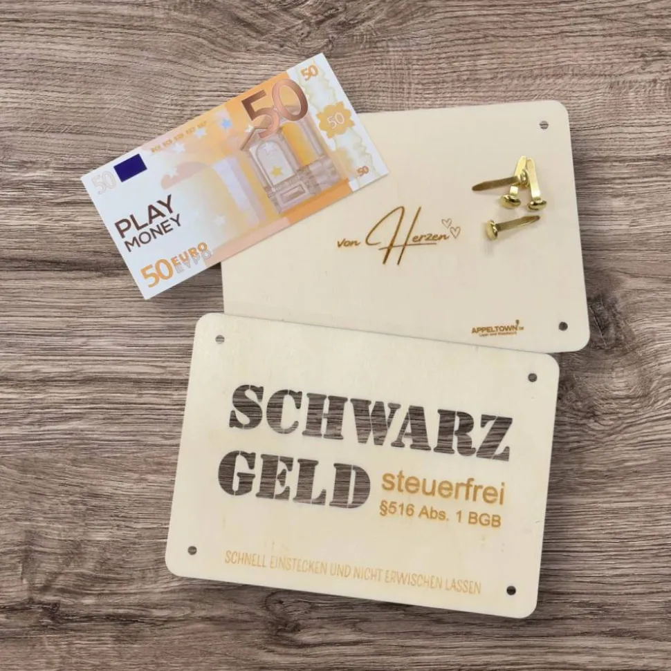 Die feine Gravur, die je nach Motiv teilweise durchgelasert ist, sorgt nicht nur für eine einzigartige Optik, sondern gibt auch den Blick auf das Innere frei – denn zwischen den beiden Holzplatten lassen sich Geldscheine, kleine Gutscheine oder liebe Botschaften platzieren. So wird aus einem einfachen Geldgeschenk eine persönliche, stilvolle und emotionale Geste.