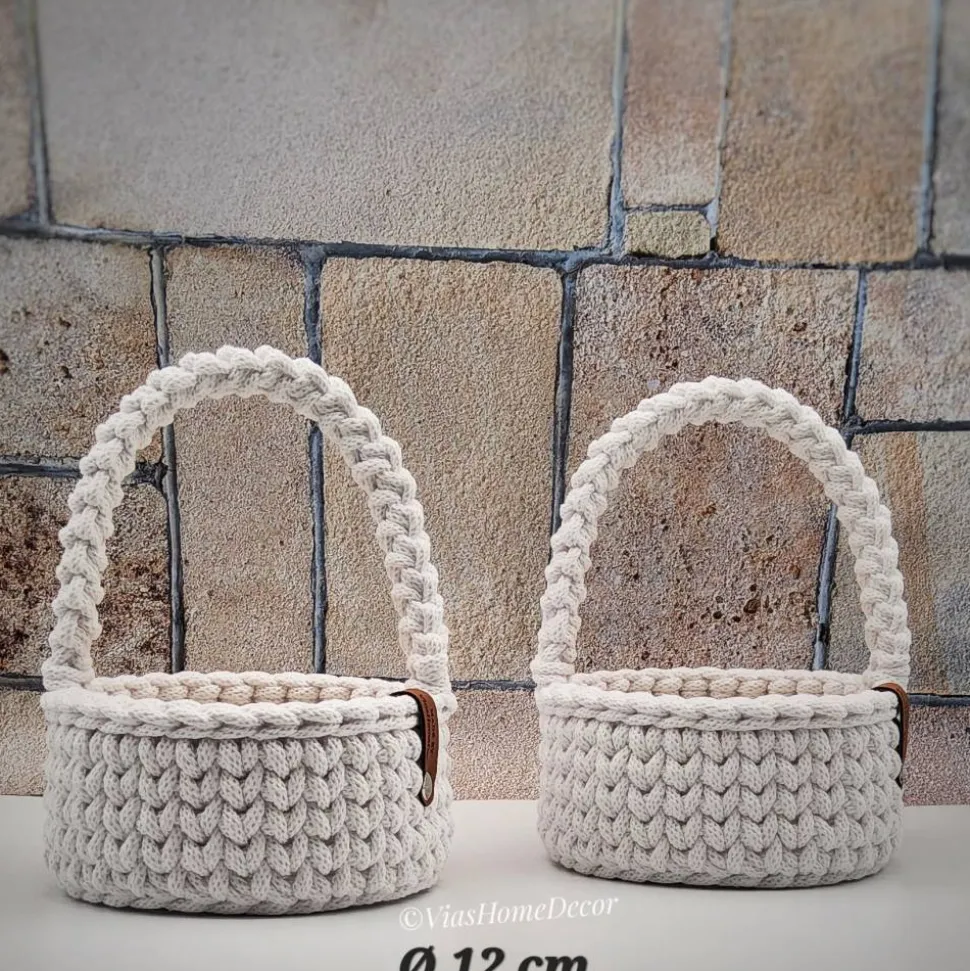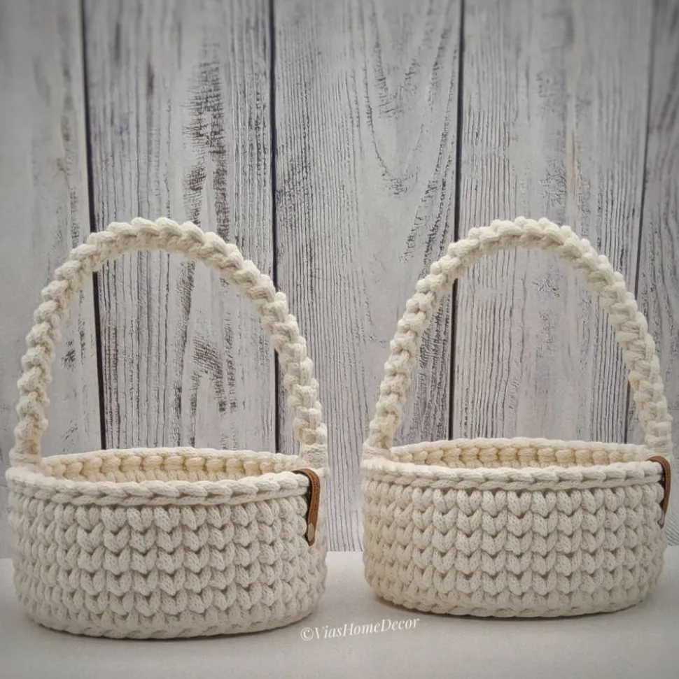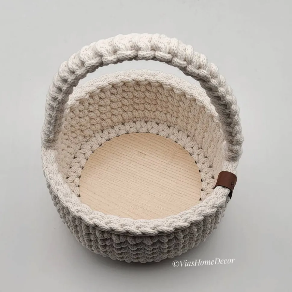 Dieser handgehäkelte Geschenkkorb mit stabilem Holzboden und einem eleganten Tragehenkel ist ein echtes Multitalent.