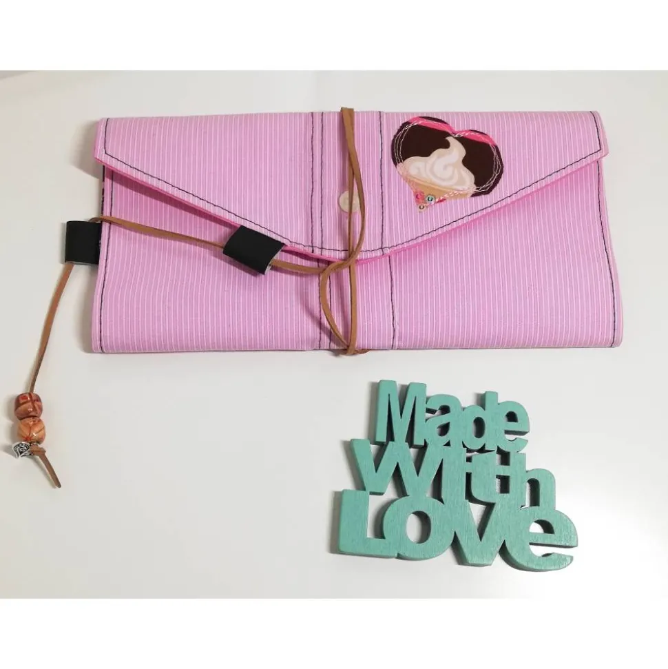 Das Kuvert besteht aus verschiedenen 100% Baumwollstoffen (Auch Herrenhemd) im Patchworkstil. Zusammengehalten wird es von einem Lederband und 2 schönen Holzperlen. Verstärkt mit Vlieseline S320. Meine Stoffe werden vor der Verarbeitung vorgewaschen.