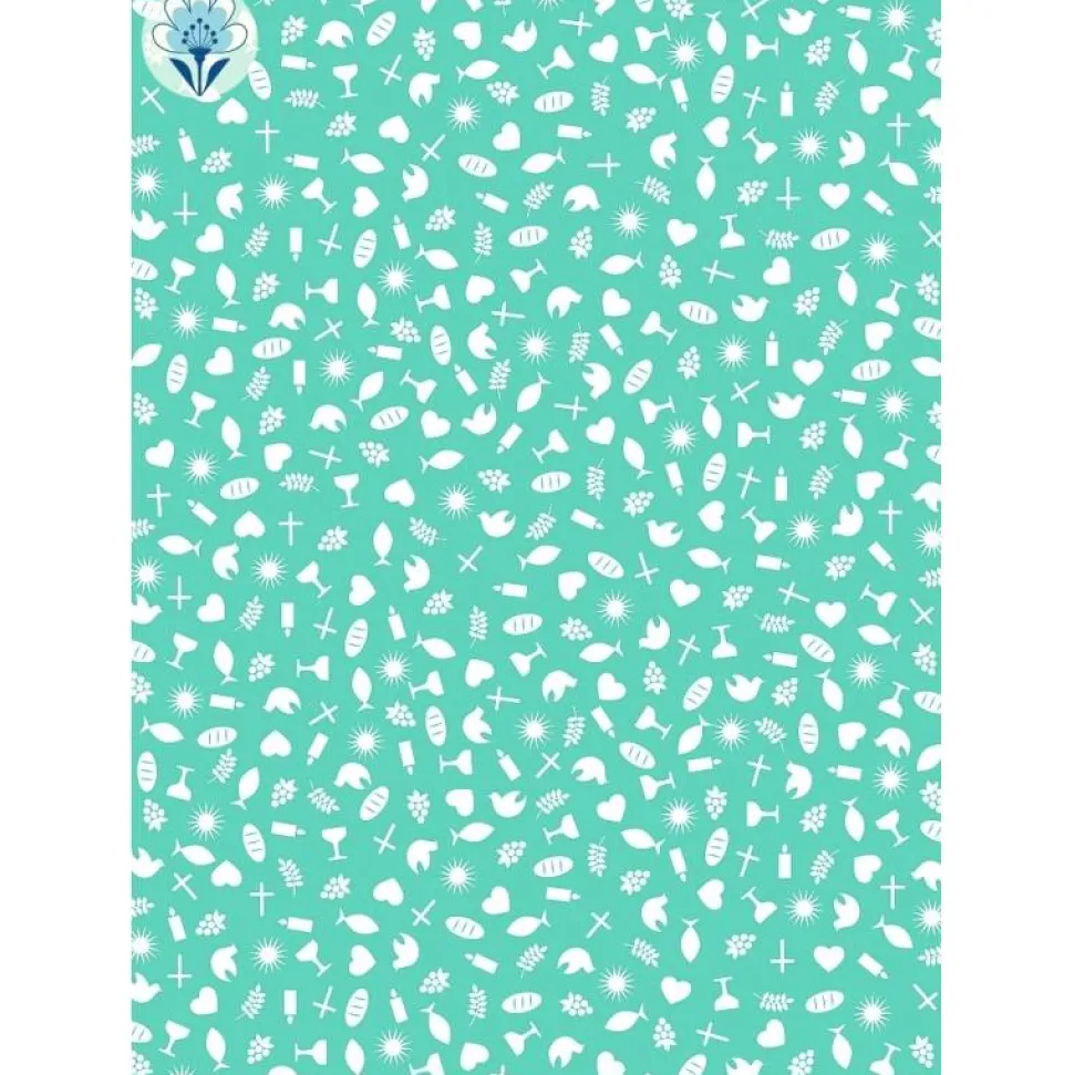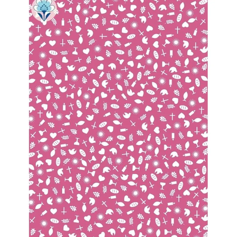 Geschenkpapier mit stilisierten Symbolen, Weiß auf Beere und auf Blau.