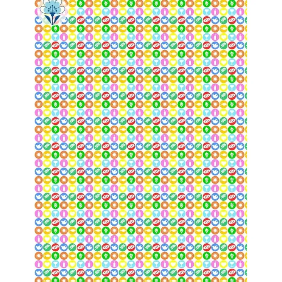 Geschenkpapier mit stilisierten Symbolen in Weiß auf bunten Punkten.