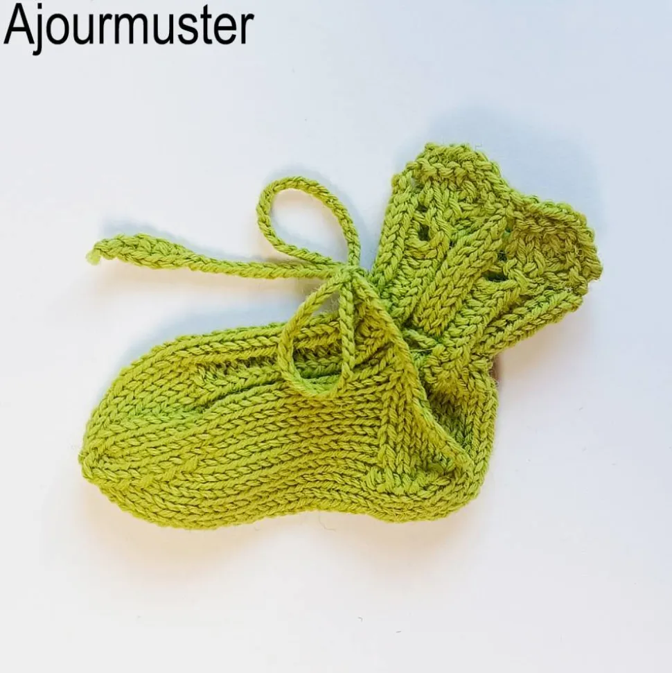 In der Schachtel befindet sich ein Paar handgestrickte Babysöckchen. Es gibt sie in drei verschiedenen Designs. Mit Ajourmuster am Bündchen, mit fröhlichen Ringeln, oder mit einem Mini-Lochmuster. Alle Söckchen haben Bindebänder. Sie sorgen für guten Halt an den Füßchen. Auf den letzten Foto sind die aktuell fertigen Söckchen zu sehen. Weitere Farben stricke ich gerne auf Anfrage.
