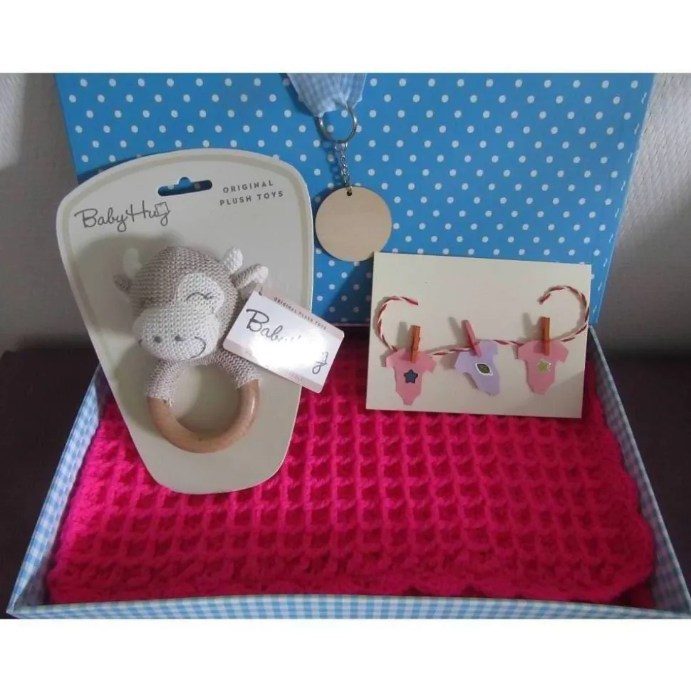 Jedes Set beinhaltet – neben Verpackung und Babydecke – eine hübsche Karte, ein Babyspielzeug und einen Holzanhänger, auf dem der Name des Babys und ein Wunschmotiv eingebrannt werden können.