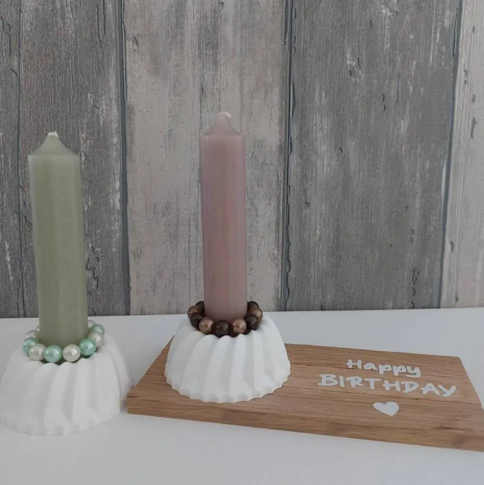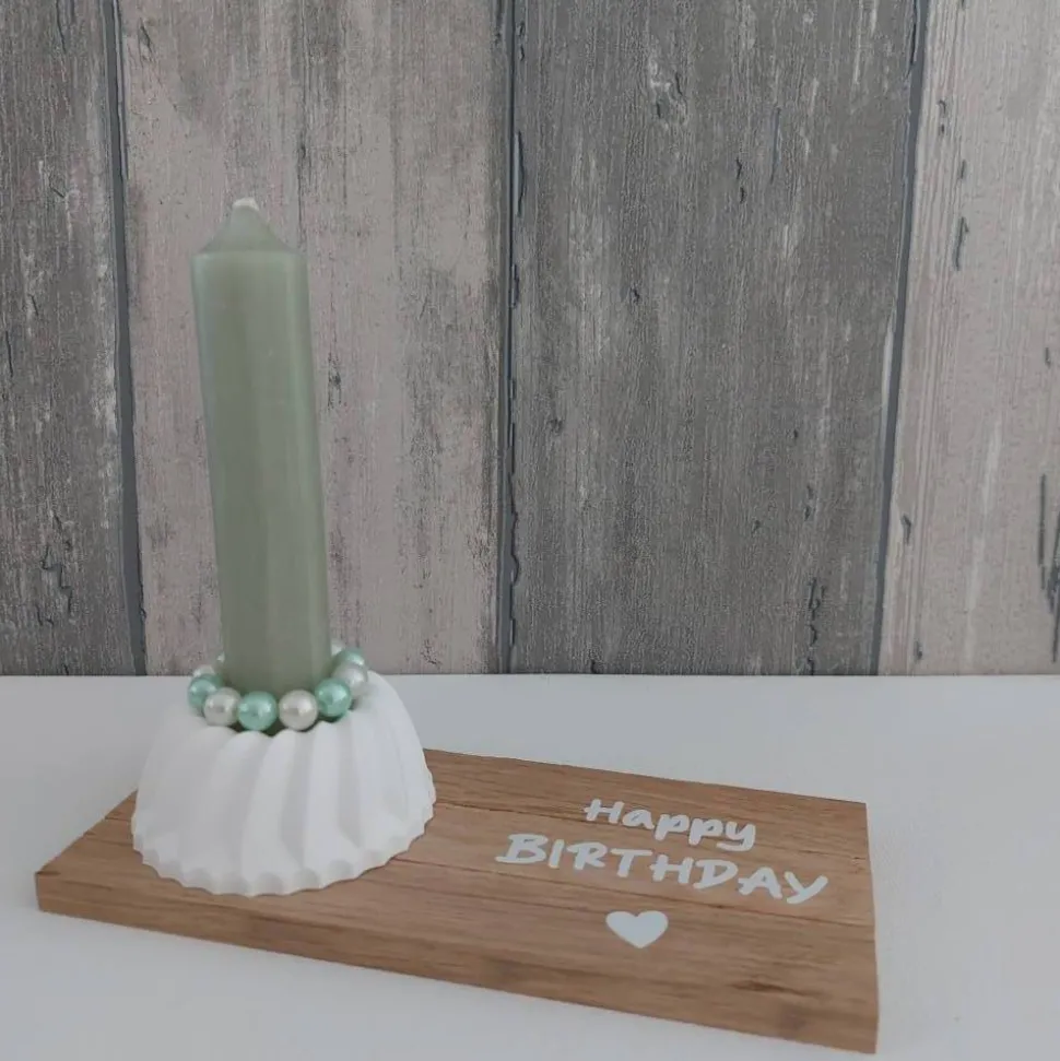 Verschenke Freude zum Geburtstag mit dem exklusiven Geschenkset Happy Birthday! Dieses liebevoll zusammengestellte Set besteht aus einem naturbelassenen Holzbrett mit weißem Aufdruck, einer eleganten Stabkerze, einem dekorativen Perlenring und einem einzigartigen Kerzenhalter in Guglhupfform aus Raysin. Jedes Stück ist handgefertigt und ein echtes Unikat.