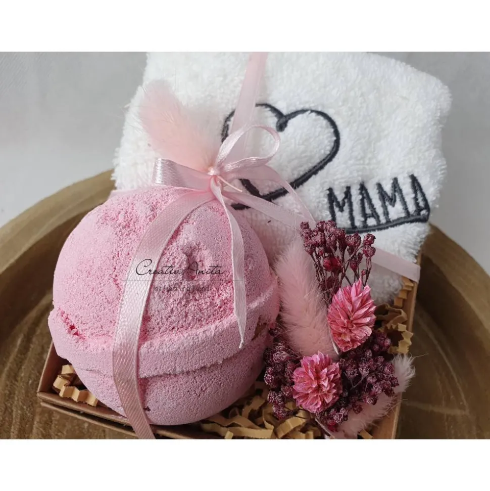 Die tolle Box ist befüllt mit einer pflegenden großen Badekugel 185g, einem süßen Gästehandtuch 50×30 cm bestickt mit „Mama“ und ein Trockenblumensträußchen.