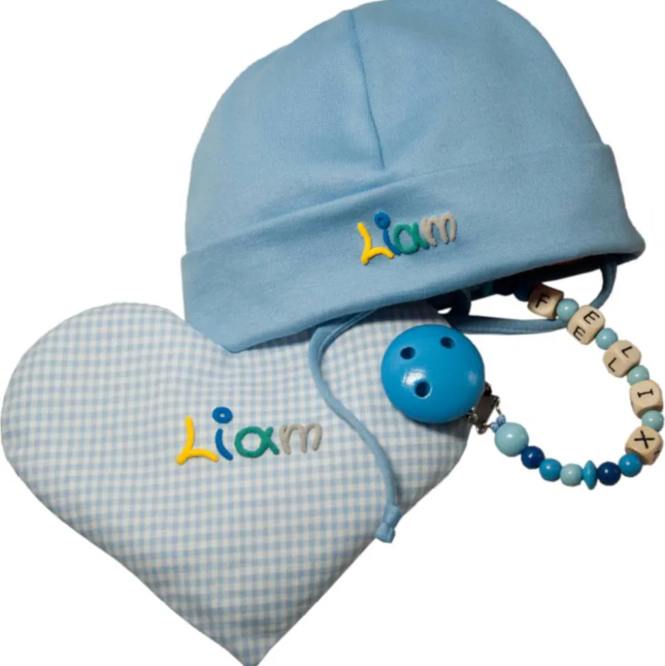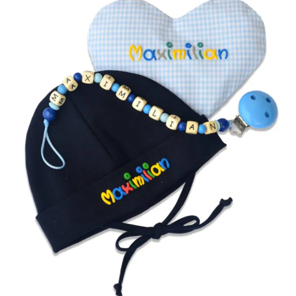 Wärmekissen, Babymütze und Schnullerette sind mit Namen beschriftet und liebevoll im Geschenkkarton verpackt, inklusive Glückwunschkarte. Das beliebte Set gibt es in vier Farben.