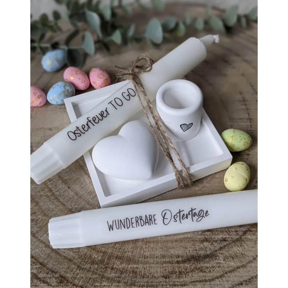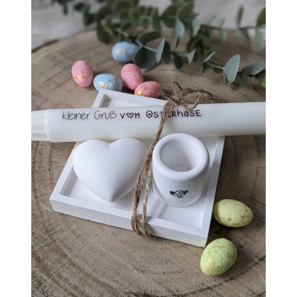 Dieses Geschenk-Set besteht aus einer eckigen Schale mit Kerzenständer, einer Stabkerze mit einem Spruch für Ostern und einem Herz.