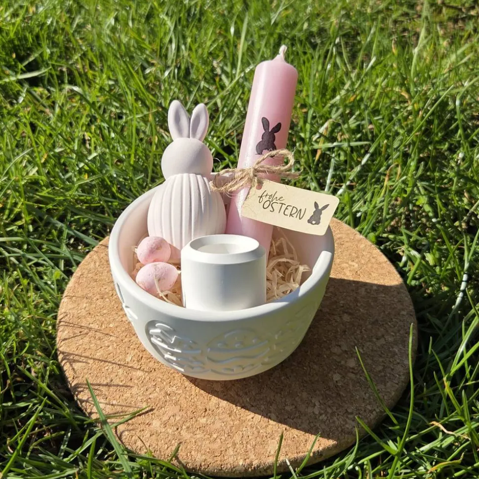 Die gefüllte Osterschale besteht aus einem kleinen Kerzenständer mit Stabkerze und einem niedlichen Osterhasen.