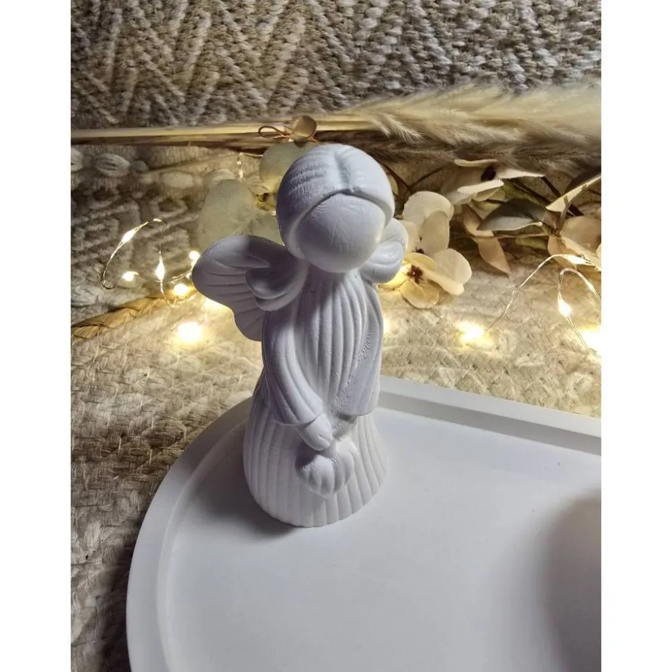 Das Set besteht aus einem handgefertigten Raysin-Tablett (Maße: 17,5 x 9,5), einer fein gearbeiteten Engel-Figur (8,5 x 3,5) und einem Teelicht im geriffelten Teelichthalter (5,5 x 6). Abgerundet wird das Arrangement durch eine hübsche Streichholzschachtel mit der Aufschrift „Schutzengel für dich“.
