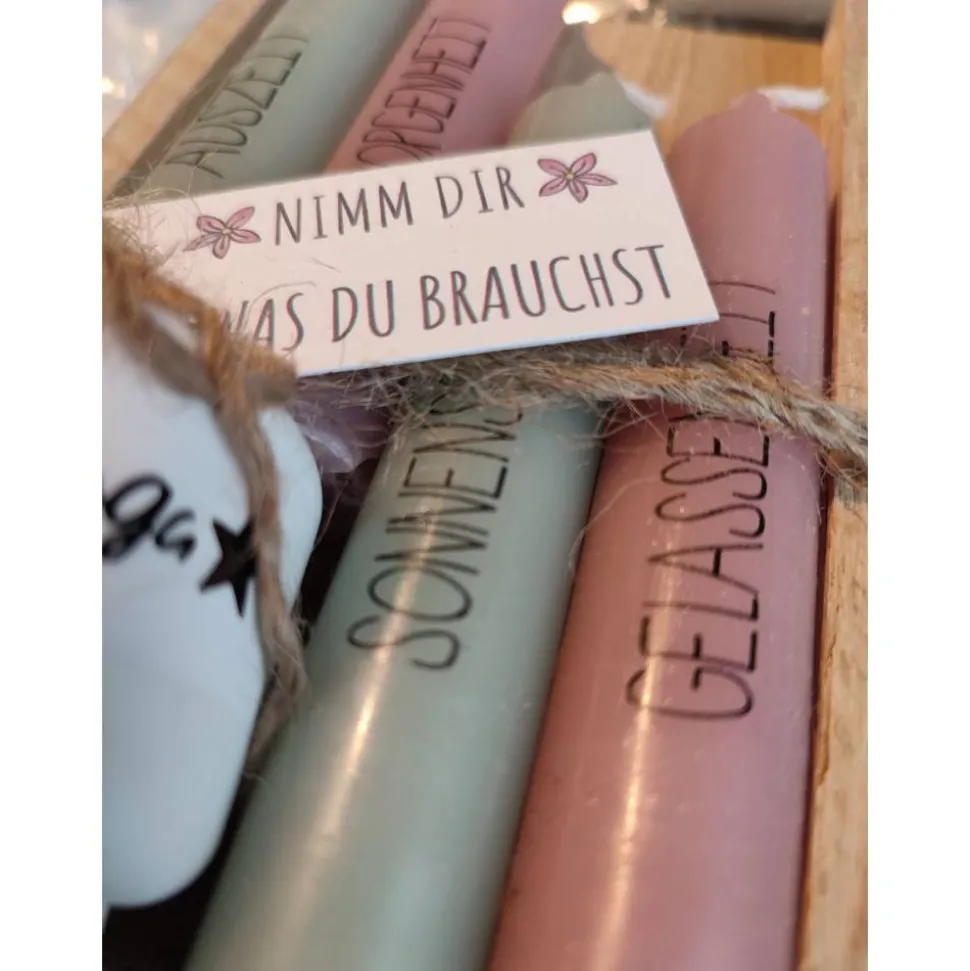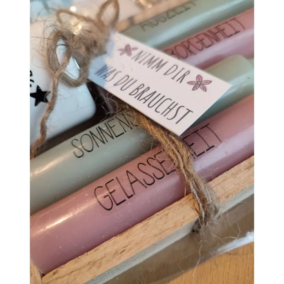 Die Texte auf den Kerzen sind auf Wasserschiebefolie gedruckt und brennen ohne Rückstände mit ab.