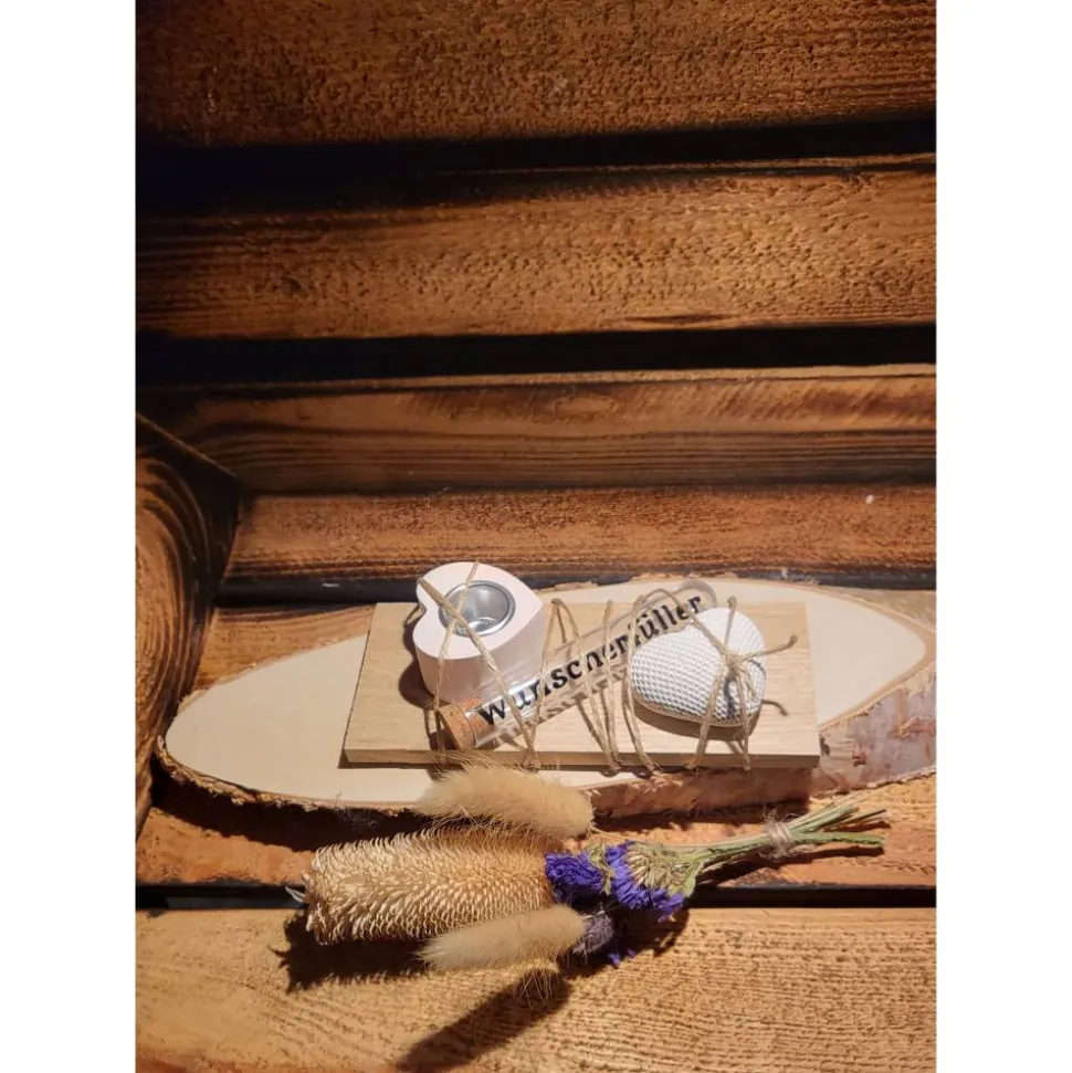 Überrasche deine Liebsten mit dem einzigartigen Geschenkset Wunscherfüller! Dieses handgefertigte Set besteht aus einer edlen Holzunterlage, einem liebevoll gegossenen Herzteelicht und einem dekorativen Herz – beide aus hochwertigem Keraflott gefertigt. Ein stilvolles Reagenzglas mit der Aufschrift Wunscherfüller rundet das Set ab und bietet Platz für einen Gutschein oder Geldschein – perfekt für Geburtstage, Hochzeiten oder besondere Anlässe.