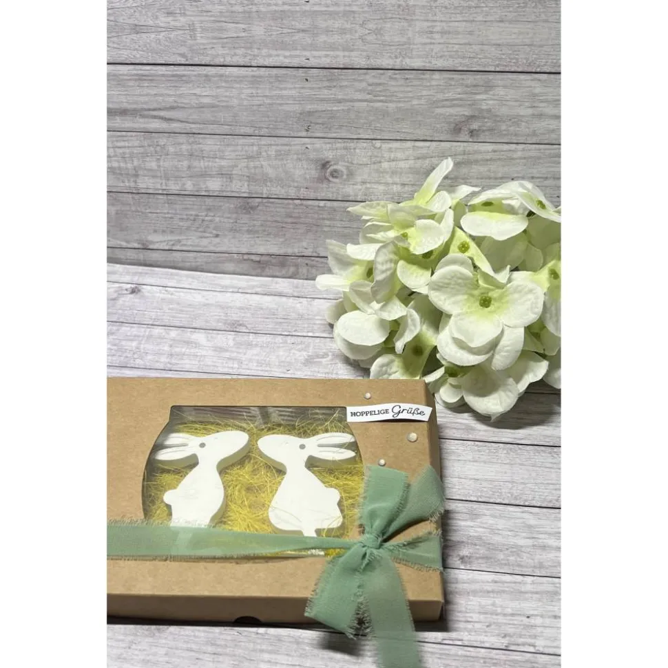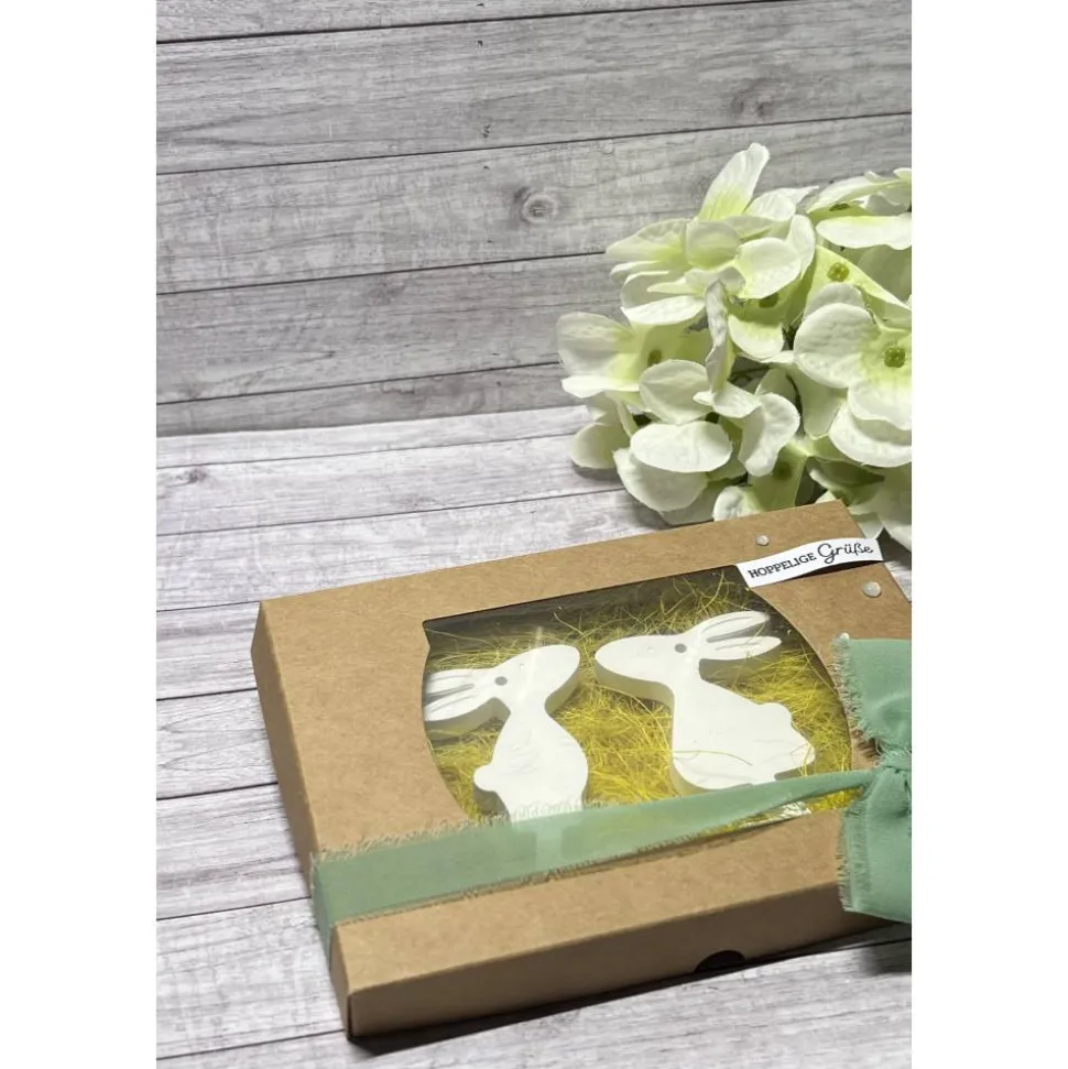 Die beiden Häschen sind aus Raysin gegossen worden und können als Anhänger verwendet werden.