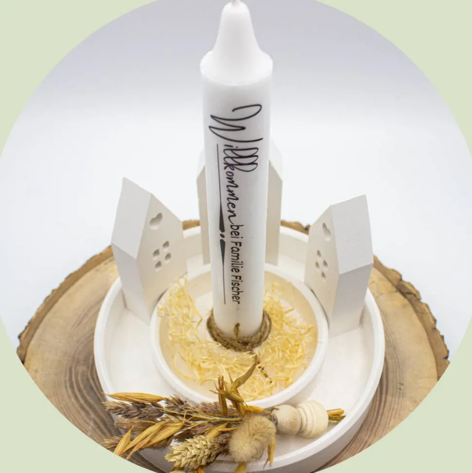 Dieses Geschenk-Set enthält nicht nur einen Kerzenhalter, sondern auch drei wunderschöne handgegossene Häuser. Zwei davon sind klein und eines ist etwas größer. Sie sind aus dem gleichen natürlichen Calciumsulfat wie der Kerzenhalter gefertigt. Die drei Häuser passen perfekt in die äußere Rille des Kerzenhalters und symbolisieren die Geborgenheit eines Zuhauses.