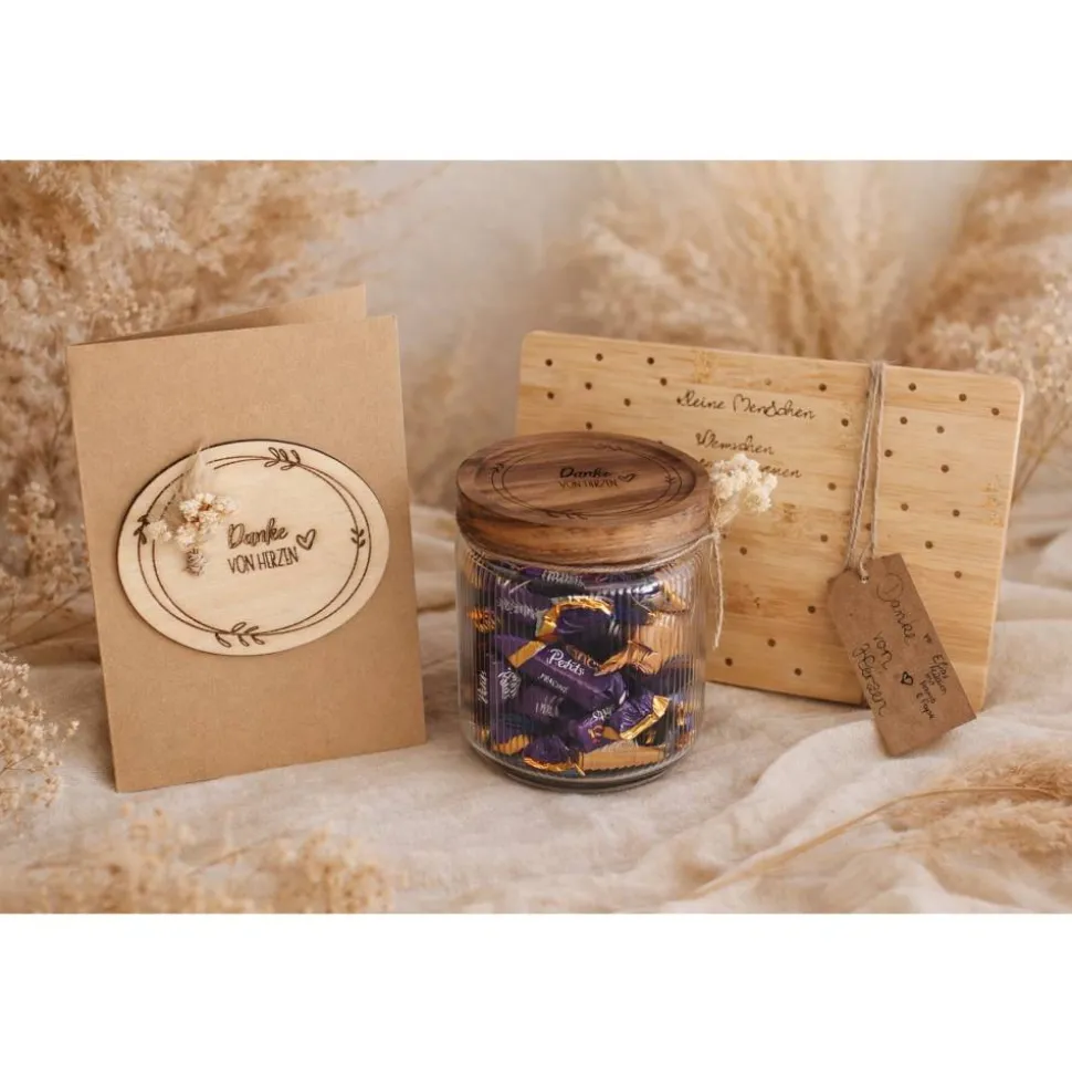 Dieses liebevoll gestaltete Set ist die perfekte Möglichkeit, „Danke“ zu sagen. Es besteht aus einer hochwertigen Karte mit Trockenblumen, einem dekorativen Glas mit süßer Füllung und einem gravierten Holzbrett mit persönlicher Botschaft.