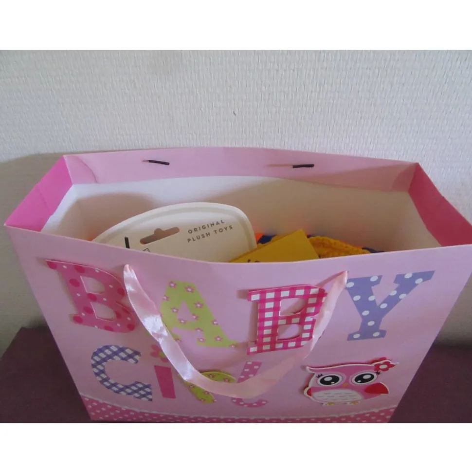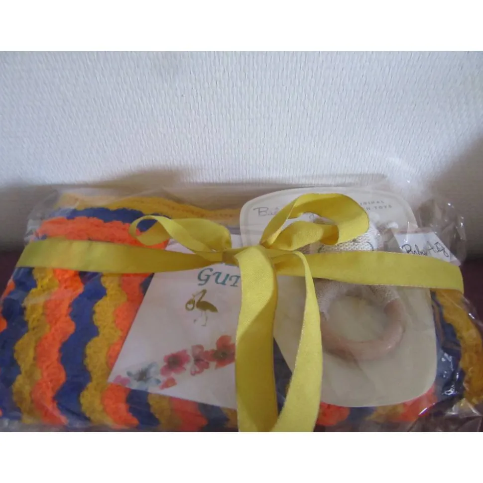 Jedes Set beinhaltet neben Verpackung und Babydecke eine hübsche Karte und ein Babyspielzeug.
