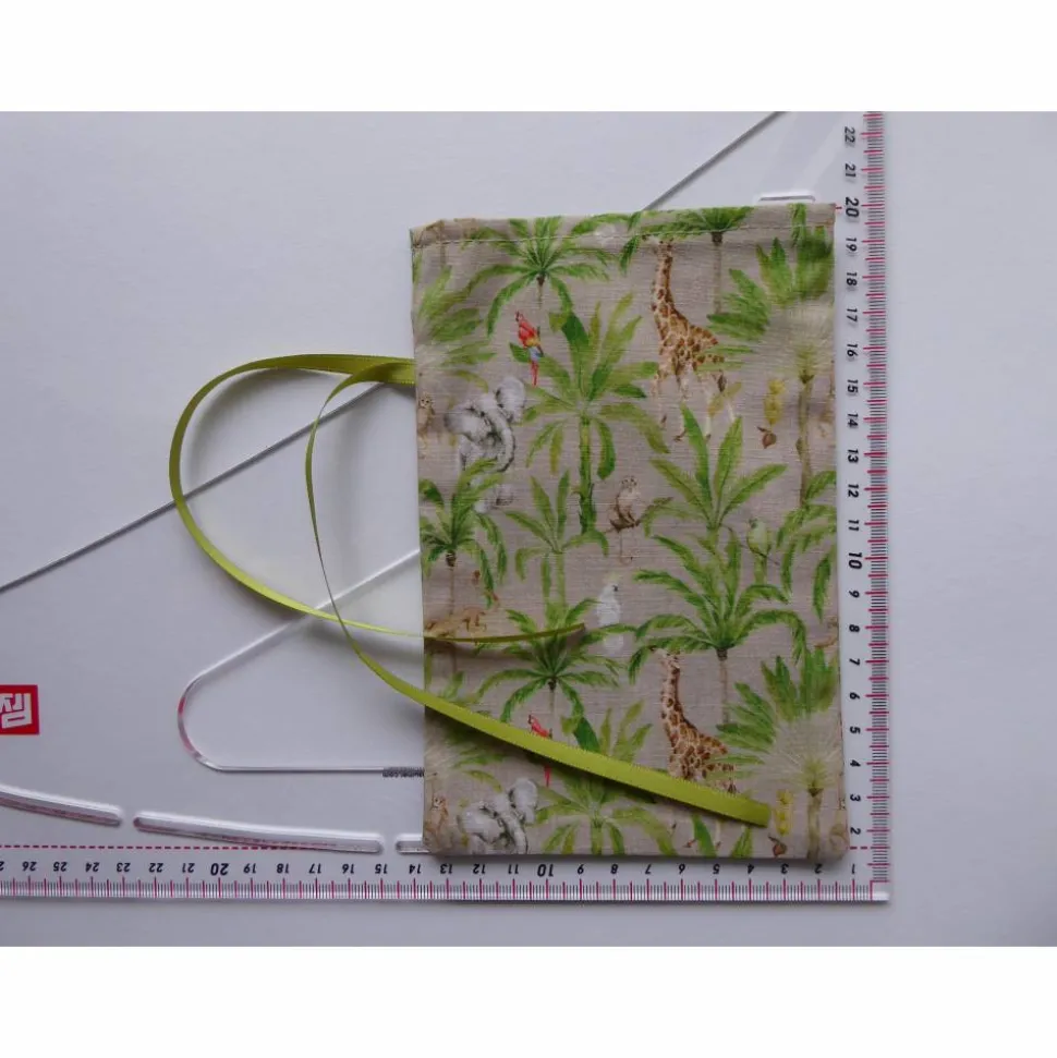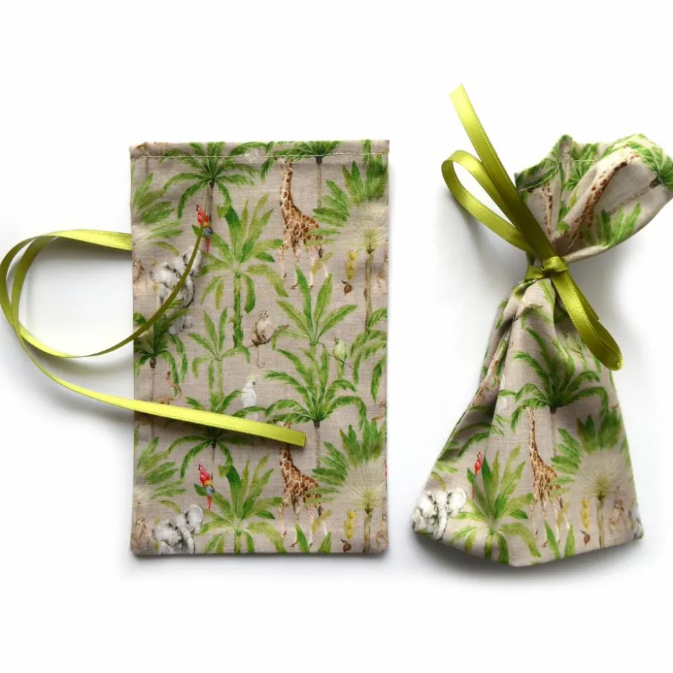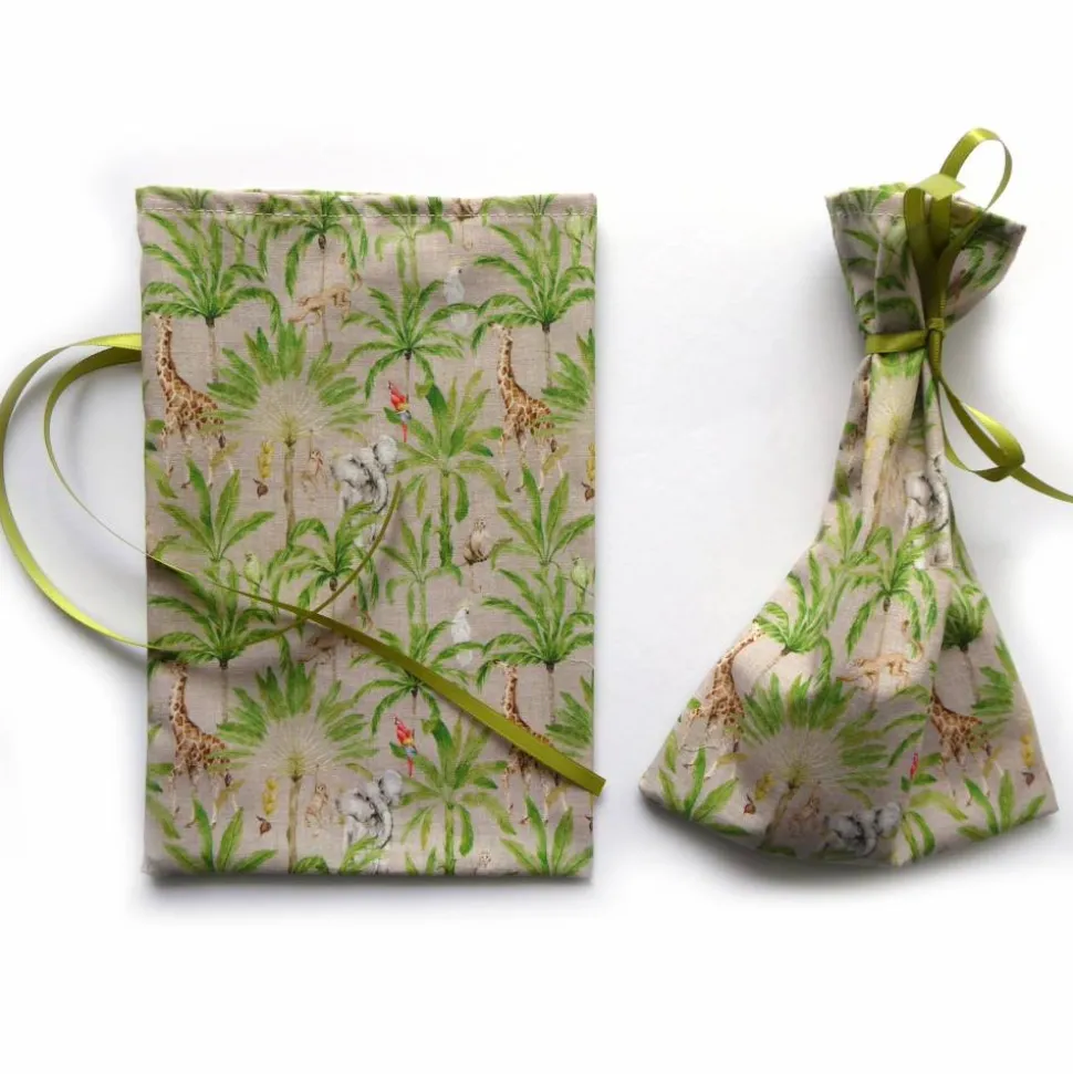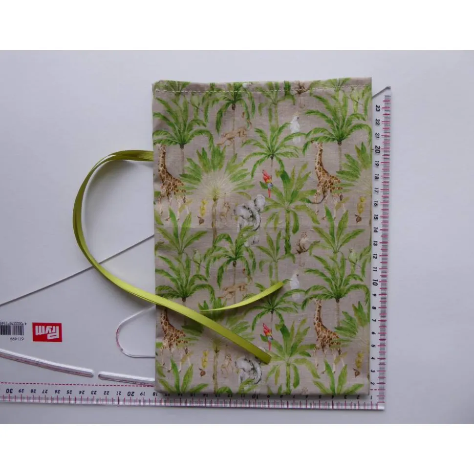 Aus Baumwollstoff in beige mit Palmen und wilden Tieren (Giraffe, Elefant, Affe, Kakadu, Papagei).