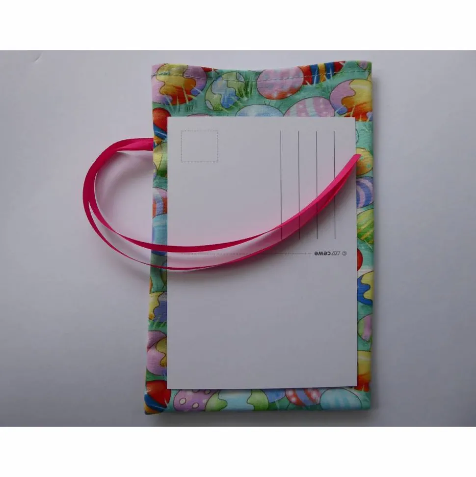 Zum Verschließen ist ein Satinband (in blau, pink, orange oder lila) fest angenäht. So geht das Band nicht verloren!
