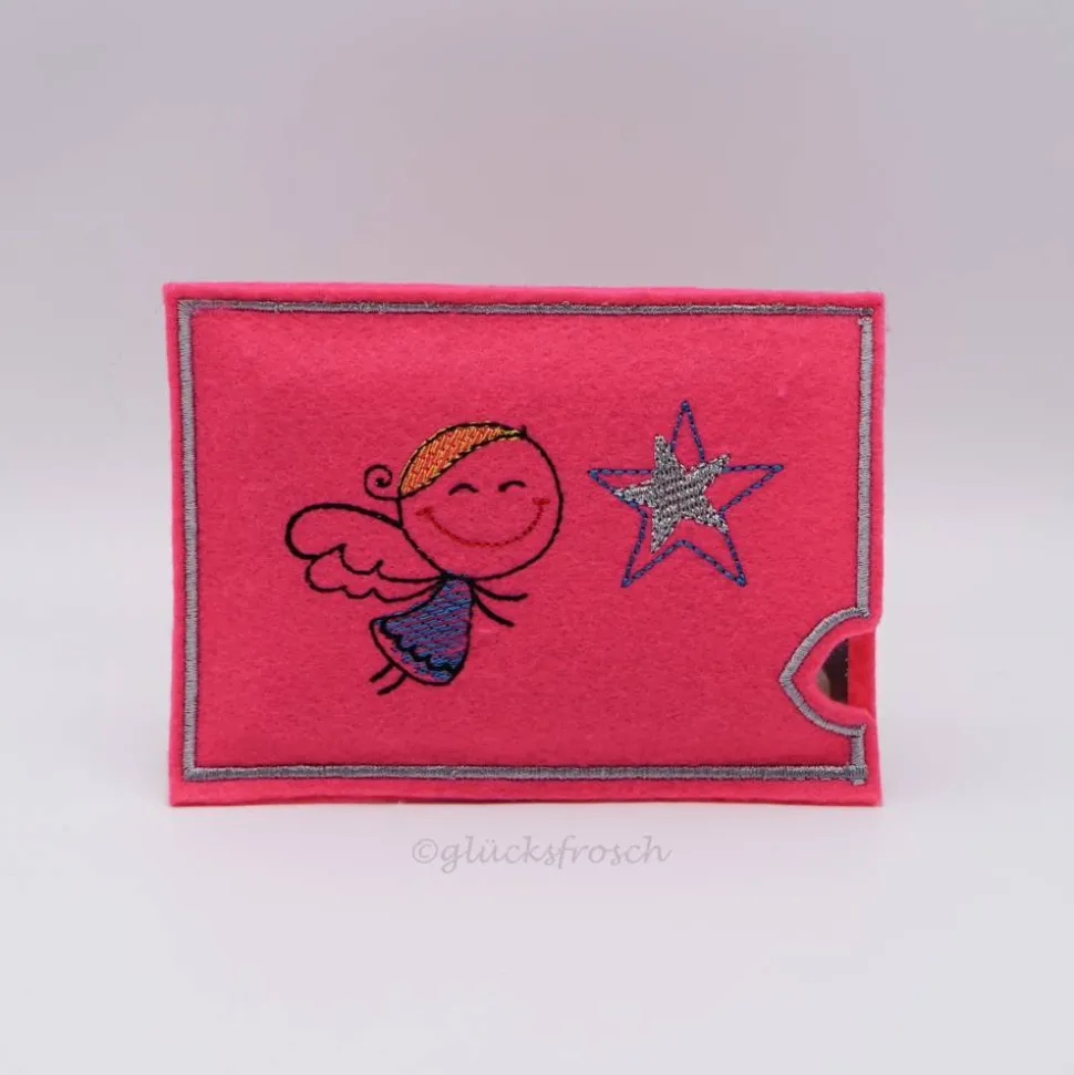 Die Hülle ist aus Filz gearbeitet und mit einem Engel mit Stern bestickt