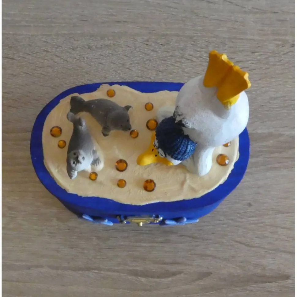 Dekoriert wurde die Truhe mit Möwe, Seehunden, Seesternen und Strasssteinen