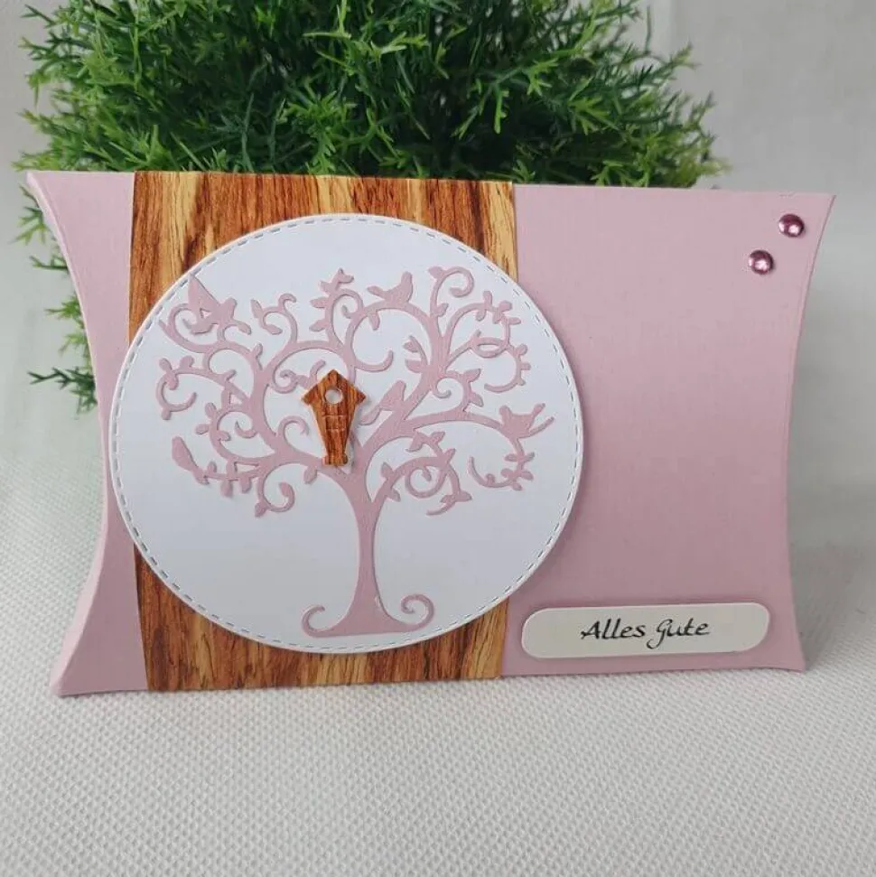 Auf der Kissenschachtel wurde eine Banderole in Holzoptik angebracht – diese ziert wiederum ein Lebensbaum in weiß.