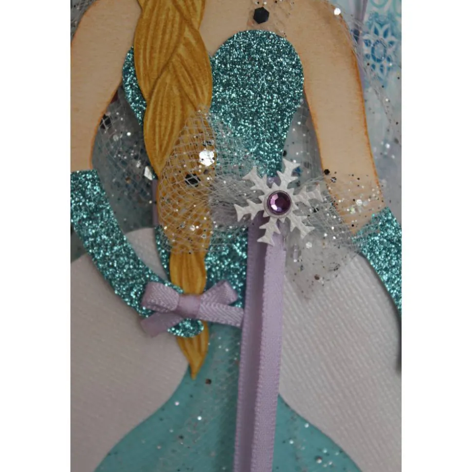 „Emmas“ Kleid ist doppelt gefertigt. Hier spiegelt sich der hellblaue Glitterkarton, der weiße Strukturkarton und der Tüll wieder.