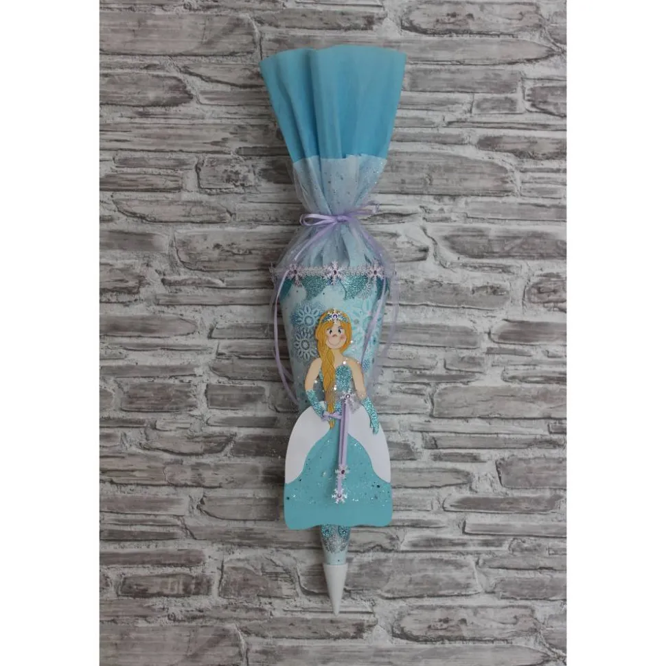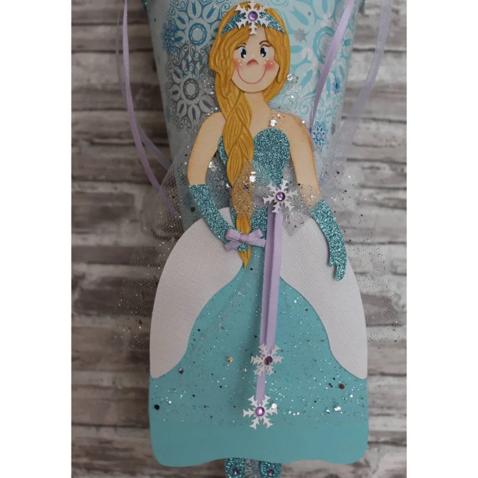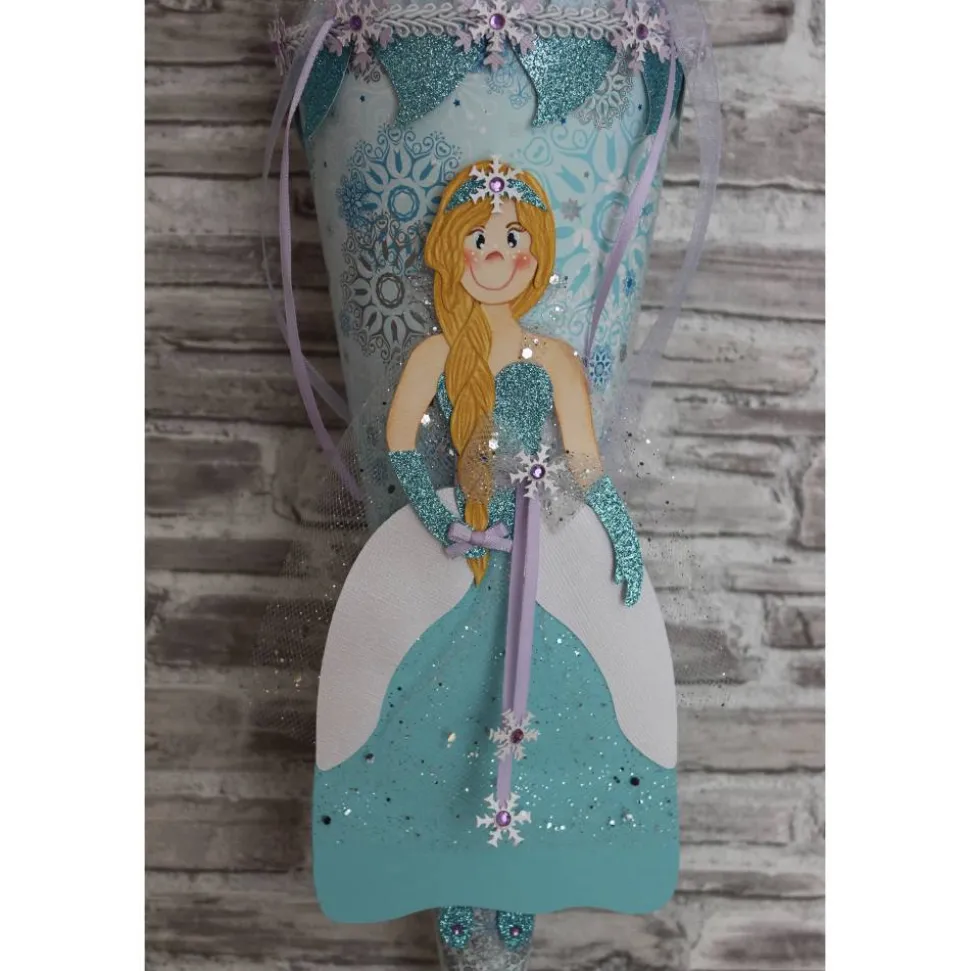 Der Schultütenrohling ist mit einem Motivkarton in Eiskristalloptik um klebt. Die verschiedenen Eiskristalle heben sich,