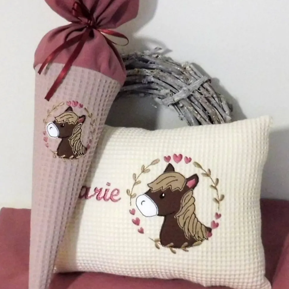 Diese kleine Zuckertüte aus altrosa Waffelpiquè und einem altrosa Uni-Baumwollstoff ist mit einem niedlichen Pony bestickt, das deinen kleinen Liebling an seinem großen, aufregenden Tag begleitet.