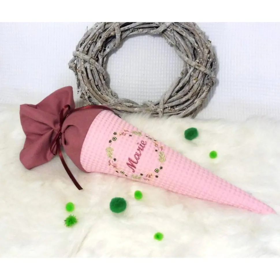 Diese liebevoll genähte Zuckertüte besteht aus rosa Waffelpiquè und einem Uni-Baumwollstoff in altrosa. Das Highlight: Der zauberhafte Blumenkranz und der individuell bestickte Name machen jede Tüte zu einem einzigartigen Erinnerungsstück.