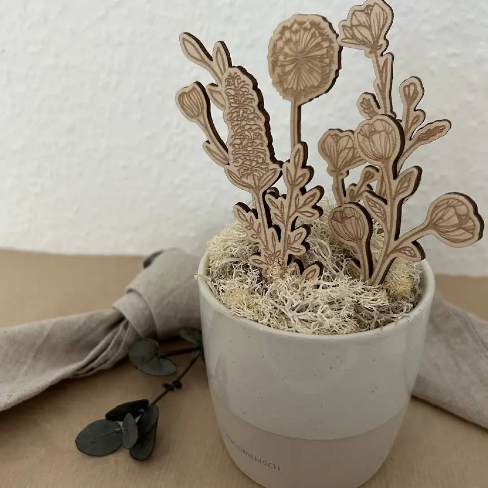 Holz ist ein Naturmaterial, weshalb es sich bei den abgebildeten Fotos um Beispielbilder handelt. Das Holz ist immer unterschiedlich hell und kann auch kleine Unreinheiten in der Maserung aufweisen. Manchmal versteckt sich auch ein kleiner Ast auf der Oberfläche. Unterschiedliche Maserungen sind gewollt und geben jedem Stück seinen einzigartigen Charakter und Charme. Die Blumen werden gebrannt und weisen daher den typischen Gravureffekt auf. Am Rand können durch das Lasern Schmauchspuren entstehen. All das stellt kein Reklamationsgrund dar. Weitere abgebildete Dekorationen oder Produkte sind nicht im Preis inbegriffen.