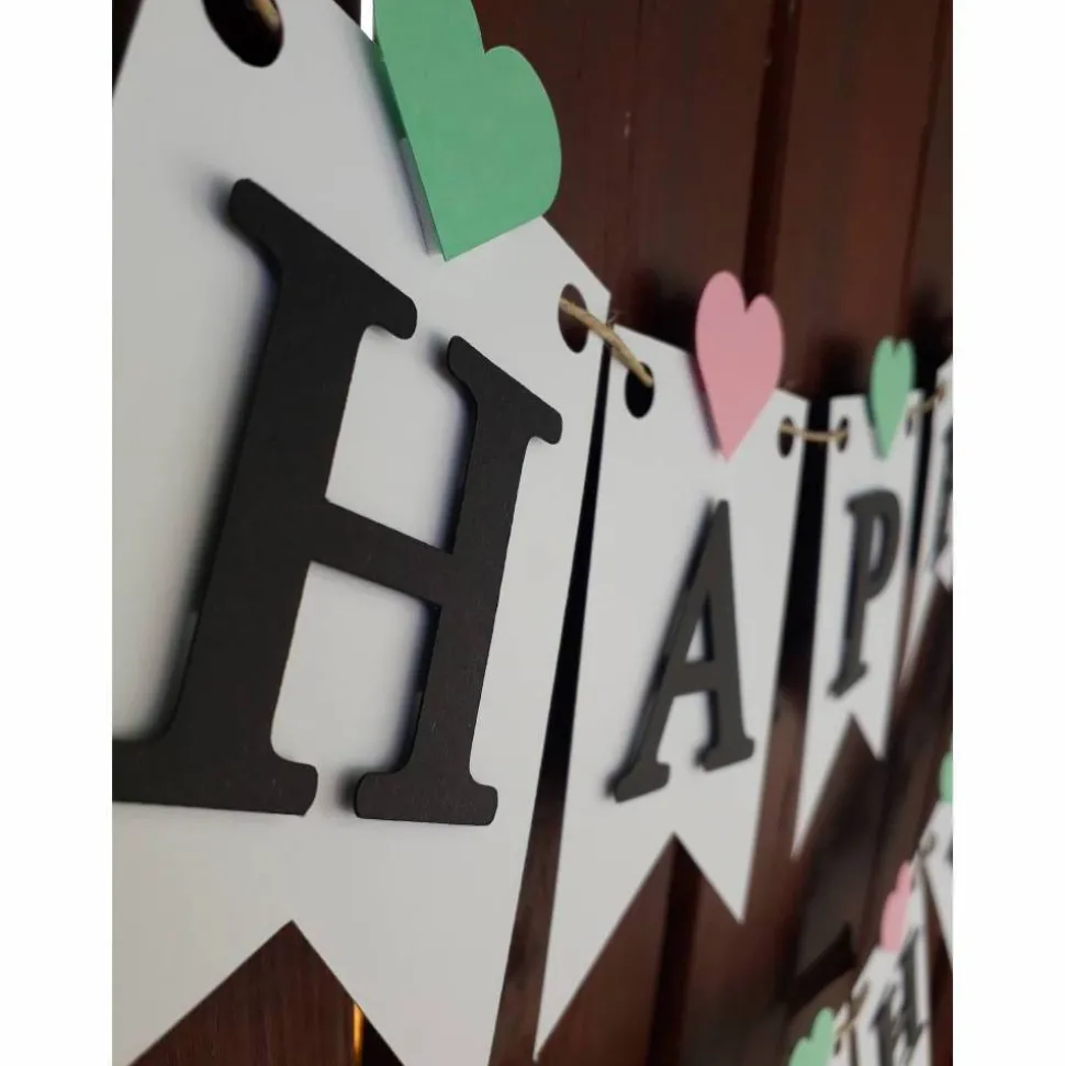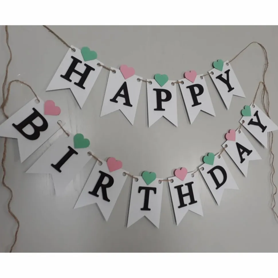 Die einzelnen Wimpel sind etwa 13,5 cm hoch und 9,5 cm breit. Durch die aufgesetzte Schrift hat die Girlande einen besonderen 3 D Effekt.