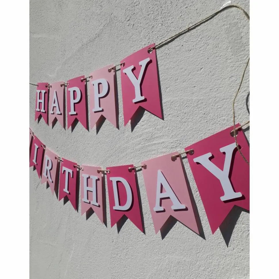 Liebevoll handgefertigte Happy Birthday Girlande in Pink – und Rosatönen mit weißer Schrift. Etwa 1,50 m lang. Besonderer 3D Effekt durch aufgesetzte Schrift. Die einzelnen Wimpel sind aus hochwertigem Papier gefertigt und jeweils ca. 13,5 cm hoch und 9,5 cm breit. Eine ausreichend lange Schnur zum Befestigen ist im Lieferumfang enthalten.