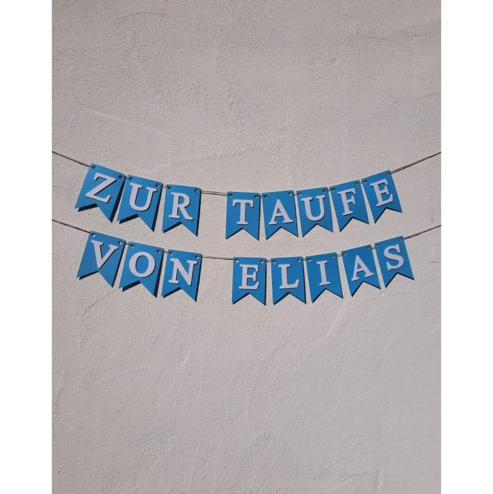 Wunderschöne Girlande zur Taufe. Personalisiert mit dem Namen des Taufkindes. Bitte hierfür die entsprechende Buchstabenanzahl auswählen und den gewünschten Namen angeben. In pastellblau mit klarer weißer Schrift. Aus hochwertigem Karton und liebevoll von Hand zusammen gesetzt.