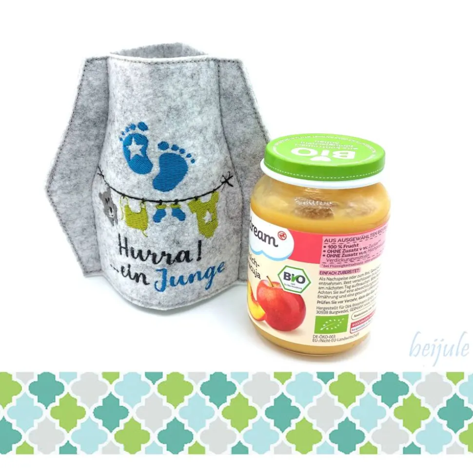 Diese Glasmanschette ist ein kleiner Allrounder. Mit einem leeren Babygläschen wird die Manschette schnell zu einer Blumenvase umfunktioniert. Oder eine nette Umverpackung für die 200 ml Sektflaschen. Gerade für Krankenbesuche ganz toll als Blumenvase geeignet oder als schnelles Geschenk zur Geburt
