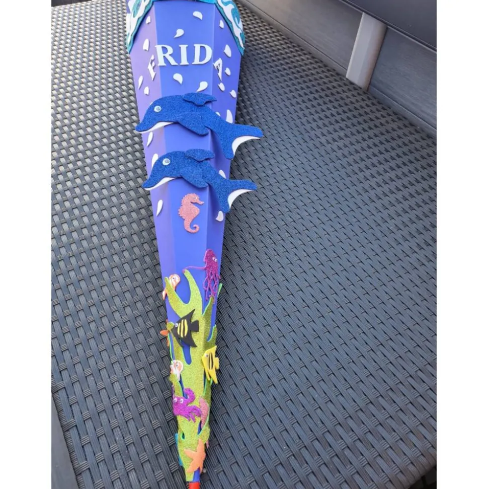 Für Tierliebhaber von Meerestieren. Diese 2 Delphine tummeln sich im Meer. Eine ähnliche Schultüte ist mit Delphinen ohne Glitzer auf der Zuckertüte