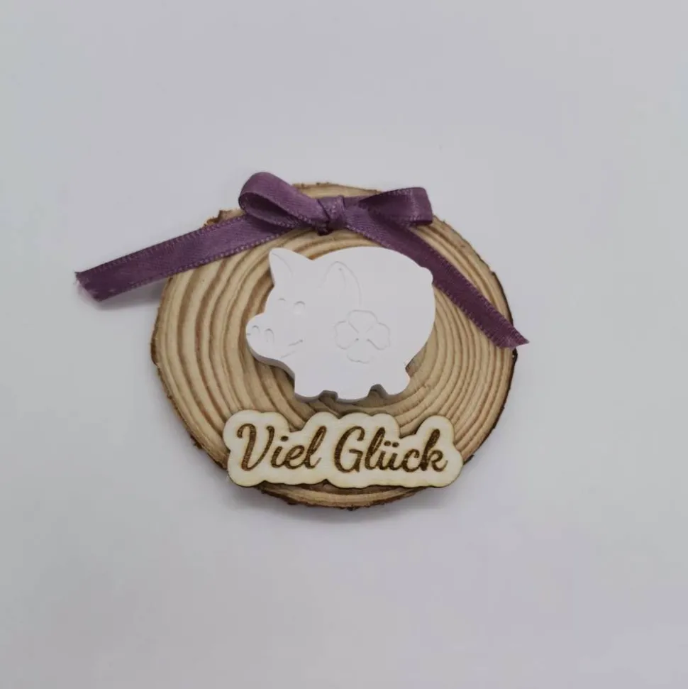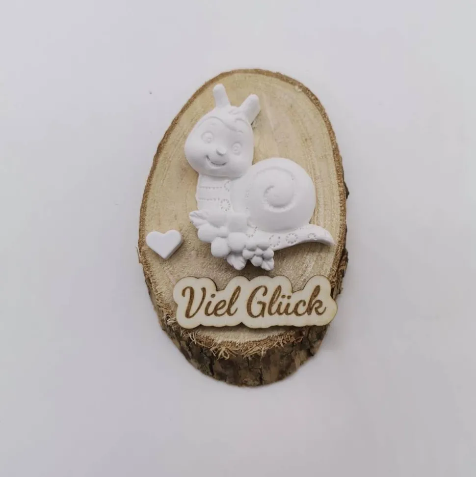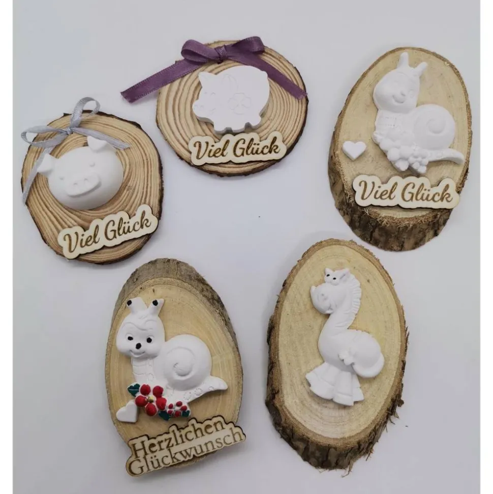 Entdecke bezaubernde, handgefertigte Glücksbringer: Schnecke, Pferd oder Schweinchen auf einer Holzscheibe!