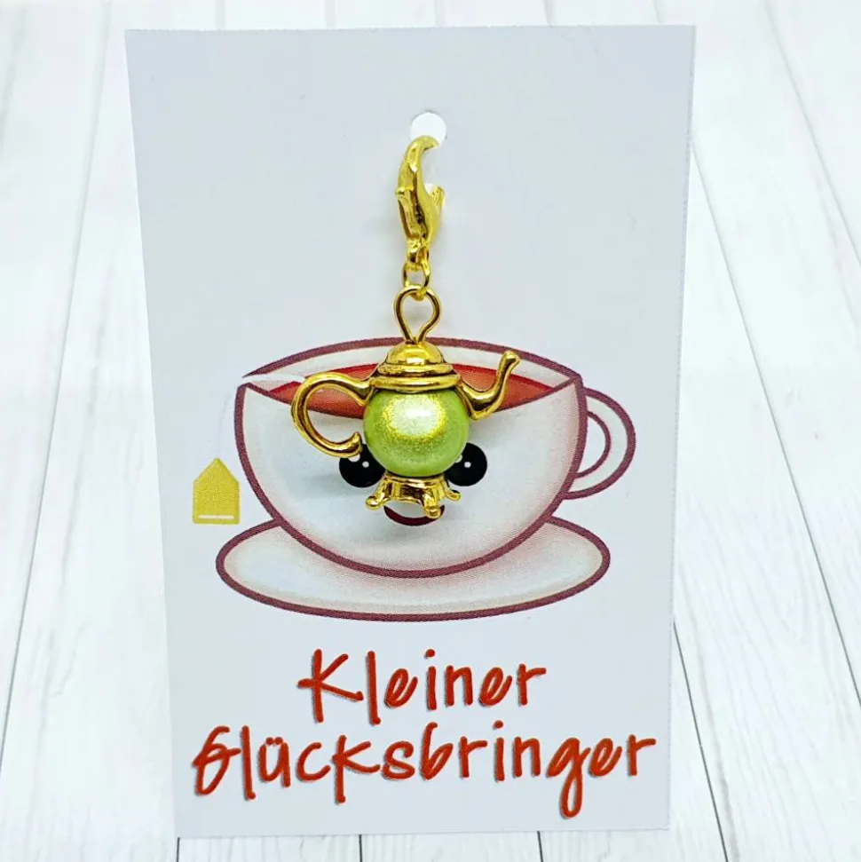 Glücksbringer Kanne goldfarben / hellgrün – Das ideale Geschenk für alle, die Tee oder Kaffee lieben! Diese niedliche Kanne passt zu jedem Heißgetränkliebhaber und bringt Freude als kleiner Glücksbringer, Mitbringsel oder Gastgeschenk.